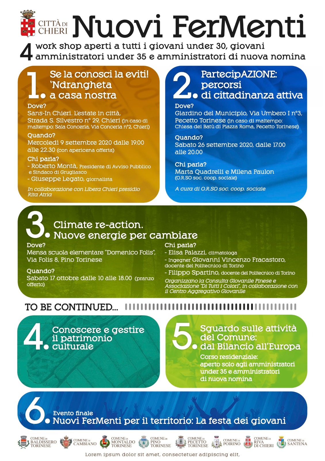 Il Comune di Pecetto Torinese, in collaborazione con il Comune di Chieri e di altri Comuni del territorio (Baldissero Torinese, Cambiano, Marentino, Montaldo, Poirino, Pino Torinese, Riva Presso Chieri, Santena), ha partecipato con successo al bando regionale “Nuovi FerMenti. Partecipazione dei giovani alla vita sociale e politica dei territori”.