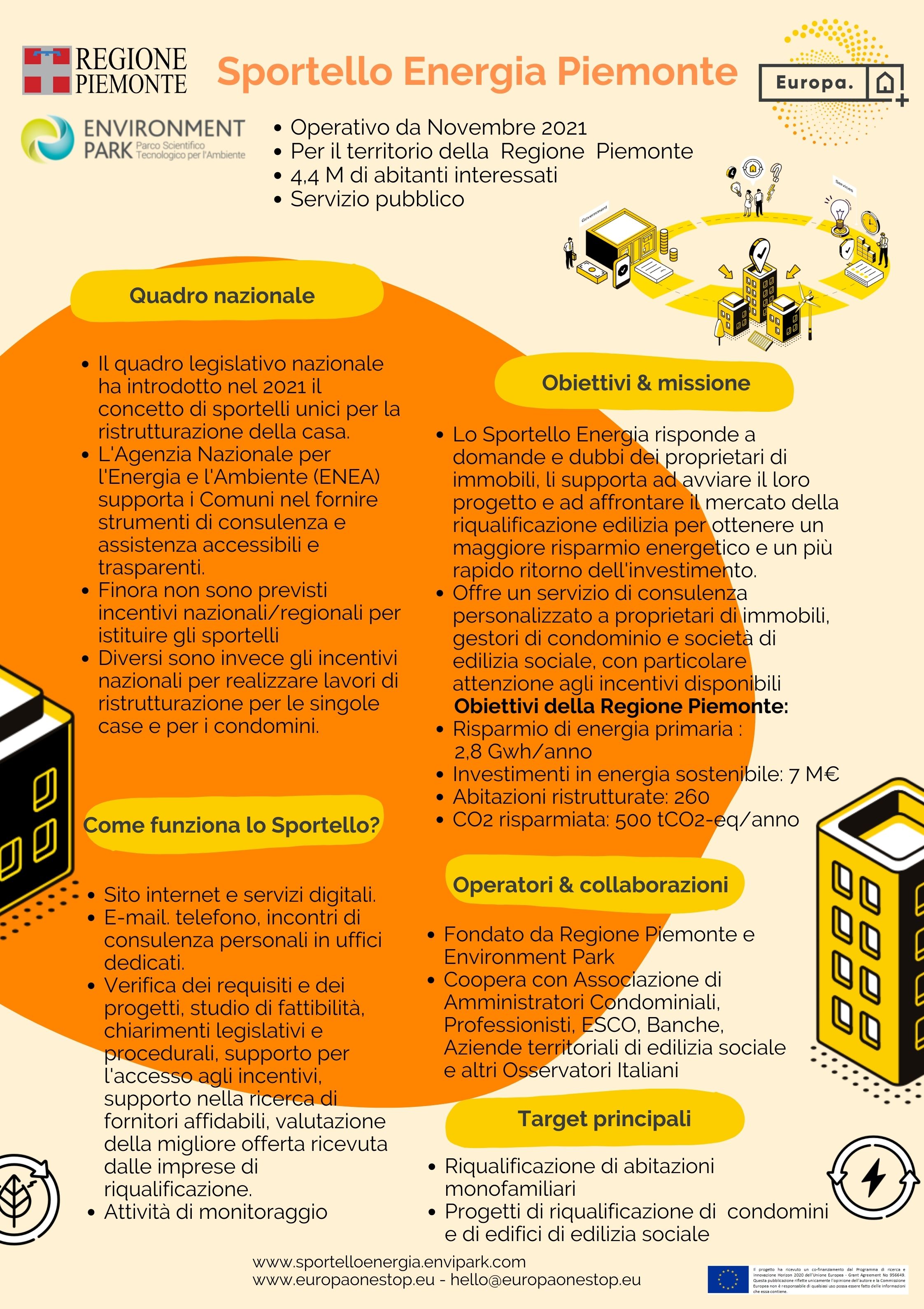 Lo Sportello Energia si propone come un nuovo servizio pubblico dedicato ai cittadini del territorio piemontese. Esso fornisce l’opportunità di usufruire di una consulenza gratuita finalizzata a rispondere a domande e dubbi dei proprietari di immobili che debbano affrontare lavori di riqualificazione energetica della loro casa. Lo Sportello li supporta a chiarire aspetti tecnici e finanziari legati all’attuazione dell’intervento, ad avviare il loro progetto e ad affrontare con i giusti strumenti informativi il mercato della ristrutturazione edilizia per ottenere un maggiore risparmio energetico e un più rapido ritorno del loro investimento.