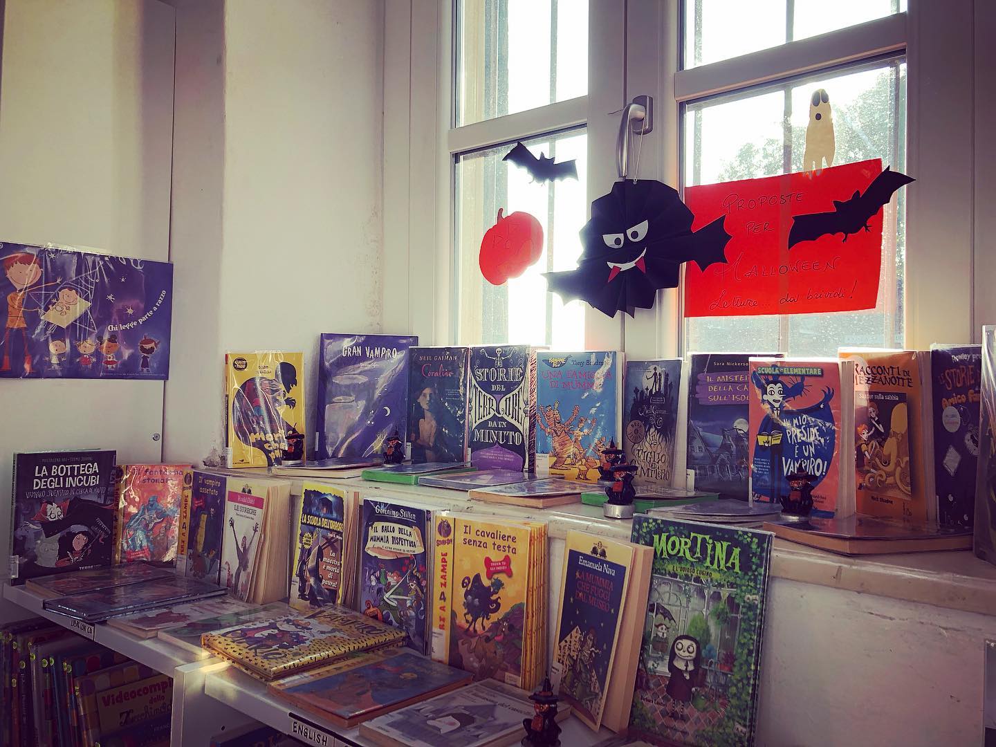 - E sempre a tema Halloween (foto al fondo) tanti libri a tema attendono bambini e ragazzi in biblioteca... C'è chi lo ama e chi lo detesta: Halloween divide! Ma per i bambini è senz'altro una grande festa: si gioca con le paure e con i travestimenti. Per noi bibliotecari è un'occasione in più per avvicinare bambini e bambine, anche quelli meno inclini, ai libri e fare promozione alla lettura. Ecco perché la Sala Ragazzi si è riempita di tante proposte di lettura, più o meno paurose, più o meno spiritose e avventurose, anche queste divise per fasce d'età!