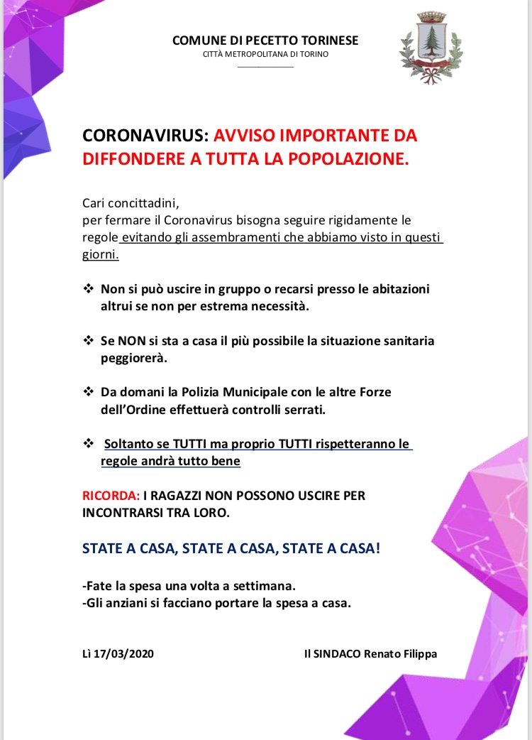 Il Sindaco ribadisce IN MODO PERENTORIO alla cittadinanza i comportamenti da tenere per limitare la diffusione del coronavirus.