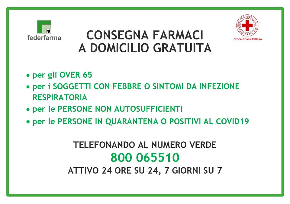 Grazie all'accordo tra Croce Rossa Italiana e Federfarma, la Croce Rossa cura la consegna gratuita dei farmaci a domicilio in particolari situazioni. Per maggiori informazioni, si può visionare il comunicato allegato.