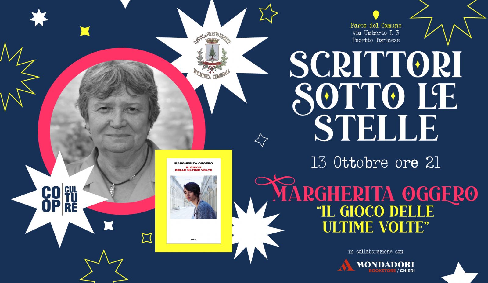 Margherita Oggero sarà nostra ospite giovedì sera, 13 ottobre alle ore 21 nell’ambito della rassegna “Scrittori sotto le stelle” organizzata dalla Biblioteca in collaborazione con la libreria Mondadori di Chieri.