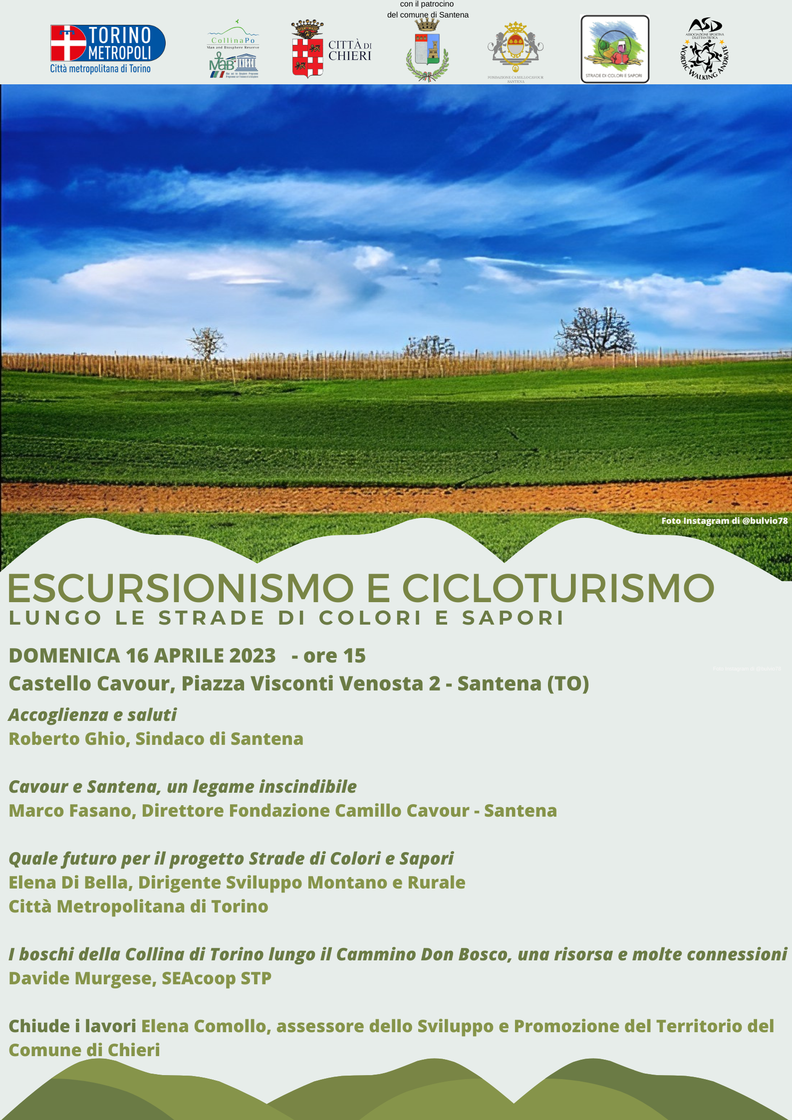 Si informa che Domenica 16 aprile 2023, alle ore 15.00, presso il salone Diplomatico del Castello Cavour , Piazza Visconti Venosta 2 - Santena, si terrà un incontro sull'argomento "Escursionismo e Cicloturismo".
