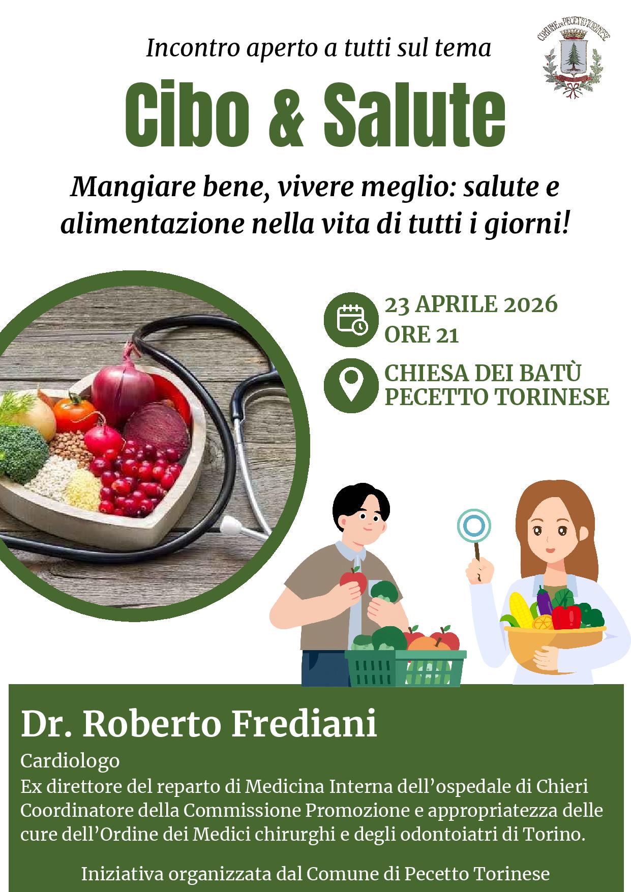 Giovedì 23 aprile alle ore 21 Chiesa dei Batù - Pecetto Torinese Cibo e Salute - Incontro con il Dr Frediani L’alimentazione è uno dei fattori fondamentali per lo stato di salute dell'individuo, ma è anche un terreno minato, dove disinformazione...