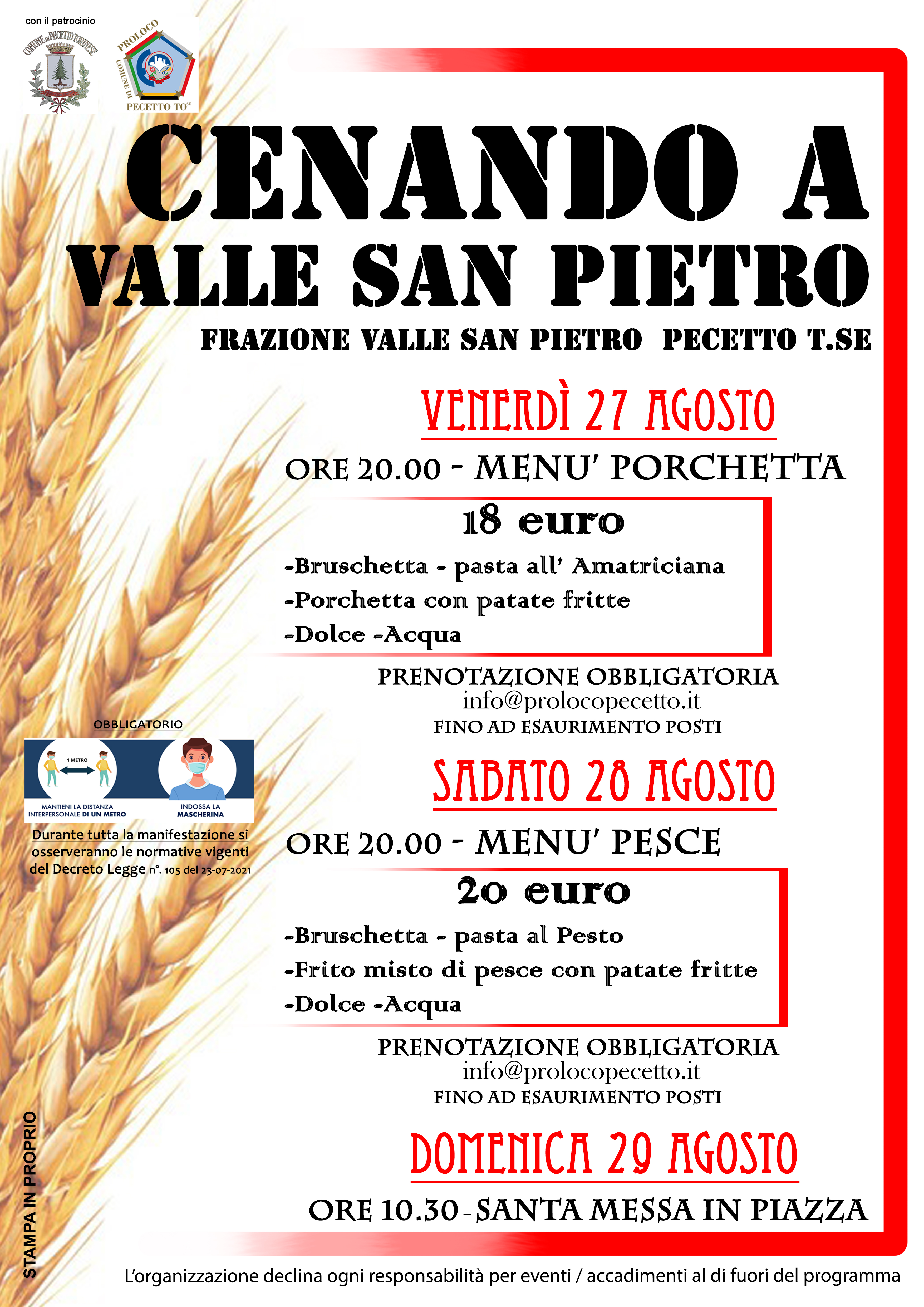 La Pro Loco Pecetto, con il patrocinio del Comune, organizza due serate gastronomiche con prenotazione obbligatoria nella Frazione Valle San Pietro: