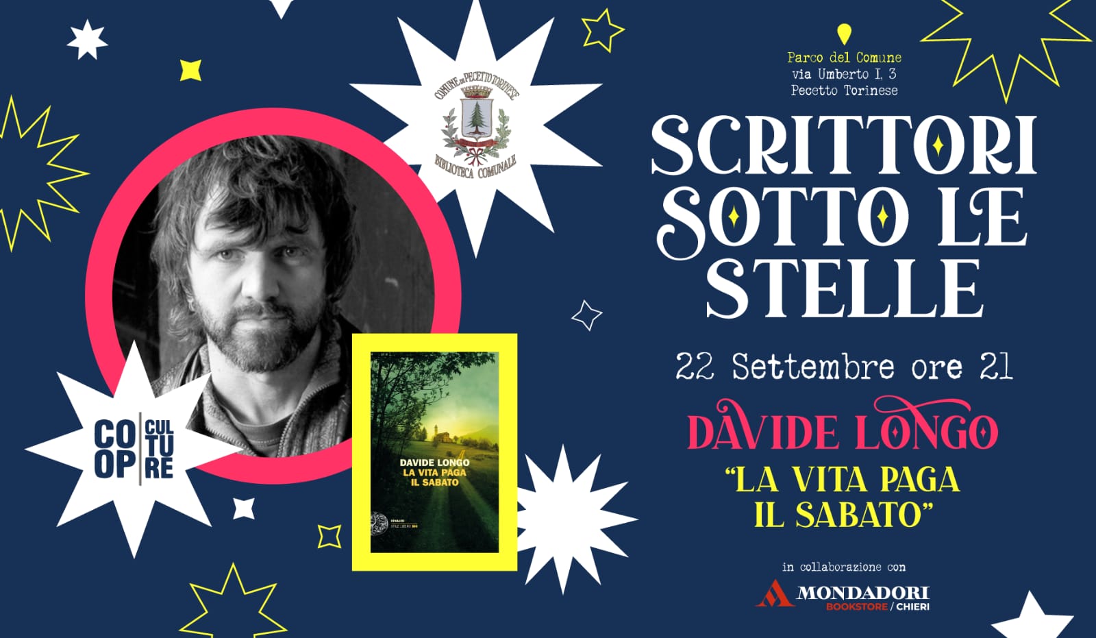 Si partirà il 22 settembre alle ore 21 con Davide Longo, che presenterà “La vita paga il sabato”, per poi proseguire con Margherita Oggero (“Il gioco delle ultime volte”), l’ambasciatore Stefano Pontecorvo (L’ultimo aereo da Kabul. Cronaca di una missione impossibile”) e Gianni Oliva (“La bella morte”).