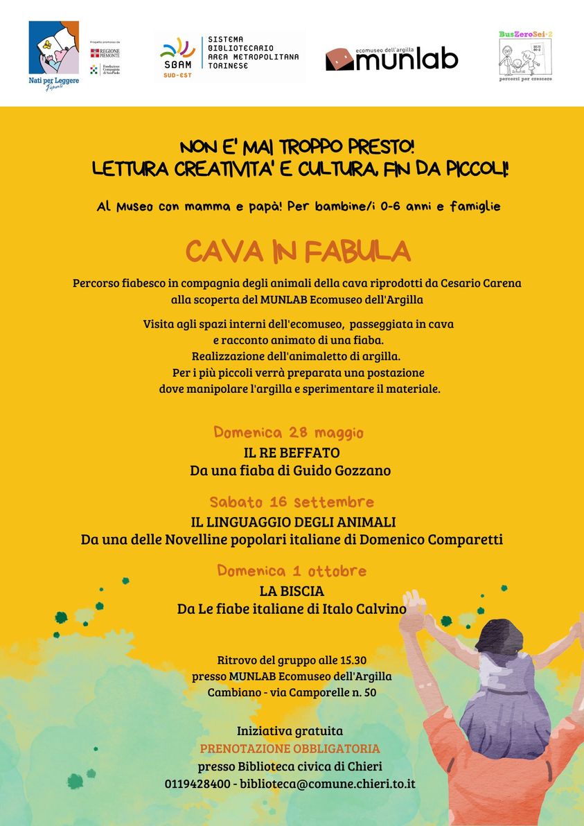 - Domenica 28 maggio alle ore 15,30 la nuova attività Cava in Fabula, un "percorso fiabesco" alla scoperta del Munlab Ecomuseo dell'Argilla, nel Comune di Cambiano.