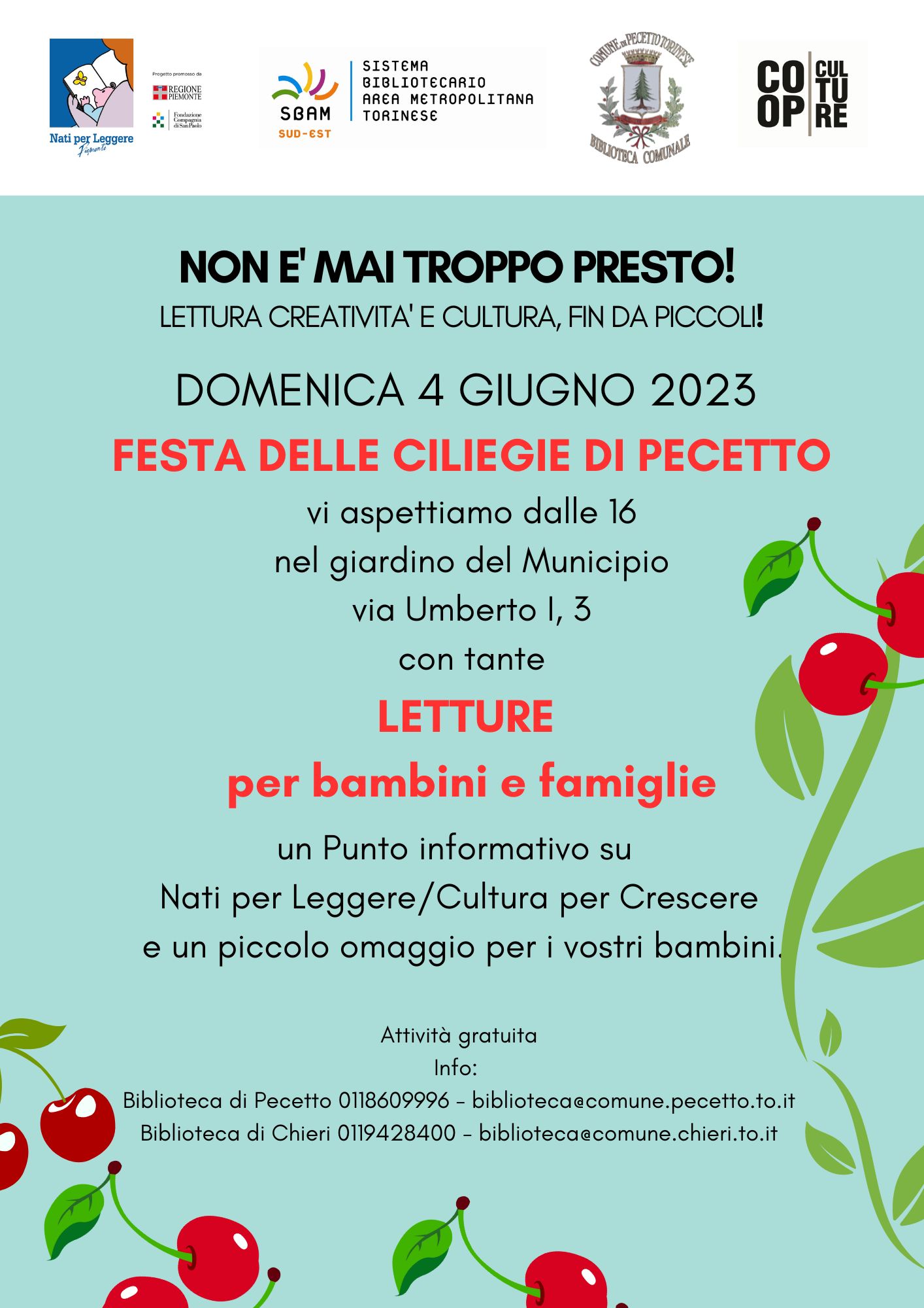 - Domenica 4 giugno dalle ore 16 nel giardino del Comune (via Umberto I, 3) in occasione della "Festa delle Ciliegie" letture per bambini 0-6 anni e famiglie, con un punto informativo (dalle ore 16 alle 18) su Nati per Leggere / Cultura per Crescere. Ai partecipanti un piccolo omaggio destinato ai bambini.
