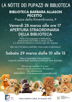 I bimbi potranno portare il proprio pupazzo del cuore in biblioteca, per lasciargli passare la notte lì, insieme ad altri amici pupazzi. Quando arriveranno in biblioteca, i pelouches saranno accolti e ascolteranno poi delle letture insieme ai bimbi. Si raccomanda di arrivare per le ore 17 puntuali!