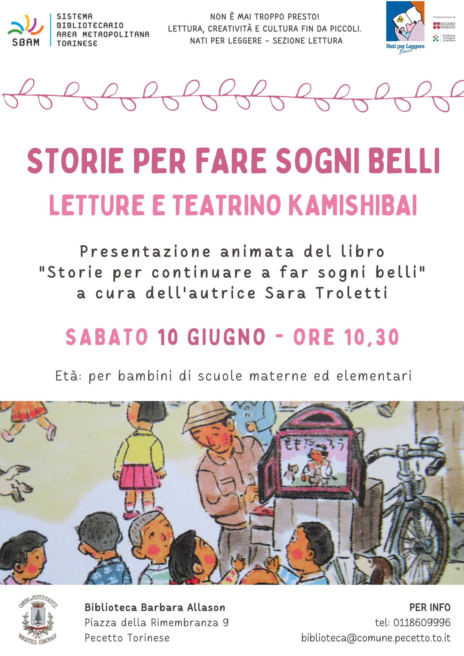- Sabato 10 giugno alle ore 10,30 in biblioteca ultimo appuntamento prima dell'estate per bambini e famiglie. Tornerà a trovarci Sara Troletti per presentarci "Storie per continuare a far sogni belli": letture animate con il teatrino kamishibai per bambini di scuola materna ed elementare. In caso di bel tempo l'attività sarà all'aperto, nel prato antistante la biblioteca (portare una copertina per sedersi a terra), altrimenti in Sala Ragazzi.