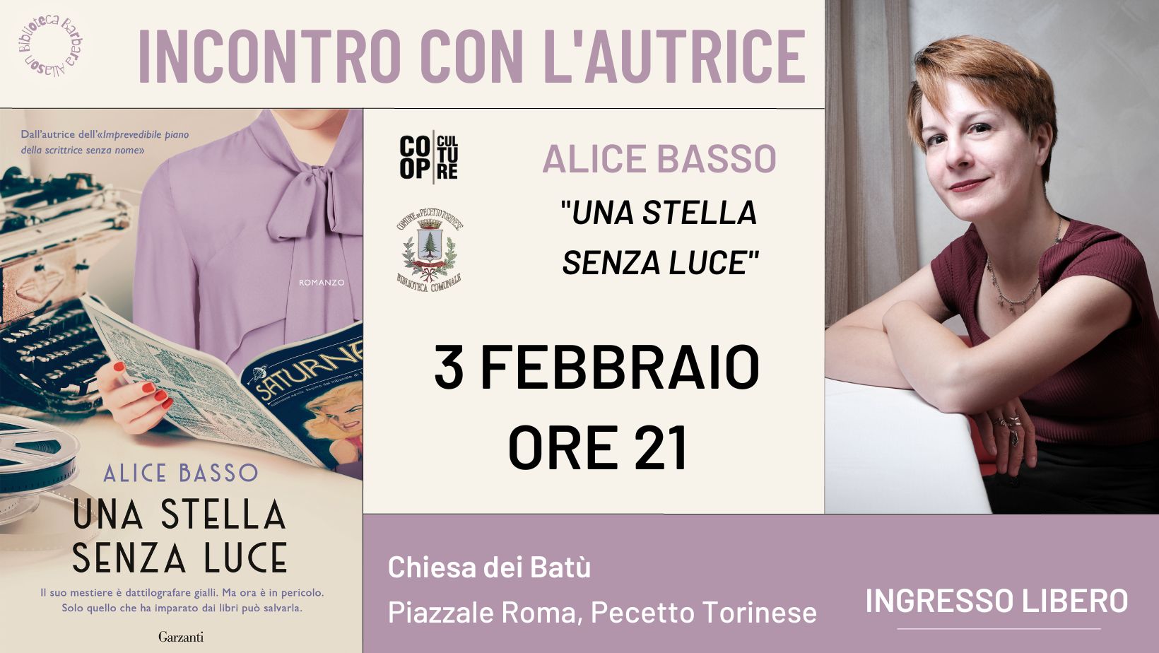 Nell’ambito della rassegna “Incontri con l’autore” organizzata dalla Biblioteca Allason, sarà nostra ospite venerdì 3 febbraio alle ore 21, alla Chiesa dei Batù (piazzale Roma, Pecetto). Ingresso libero e gratuito.