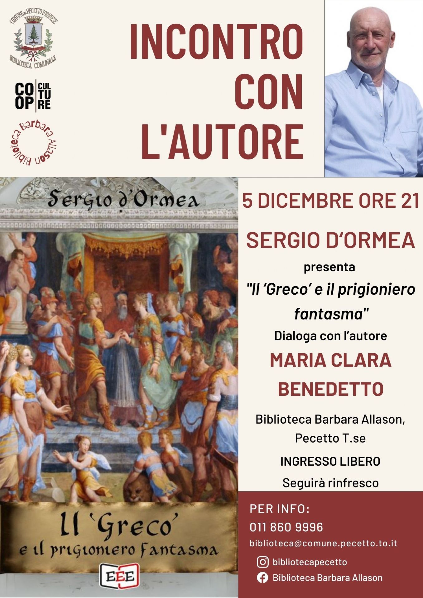 Tornano in biblioteca gli "Incontri con l'autore": tocca a Sergio d'Ormea chiudere questo 2024. Dialogando insieme a Maria Clara Benedetto, presenterà il suo ultimo romanzo storico "Il 'Greco' e il prigioniero fantasma" giovedì 5 dicembre alle ore 21 in biblioteca (piazza della Rimembranza 9, Pecetto).