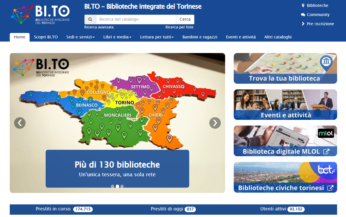 Il Sistema bibliotecario urbano delle Biblioteche civiche torinesi e il Sistema bibliotecario dell'Area metropolitana SBAM si sono uniti per dar vita a BI.TO - Biblioteche Integrate del Torinese. Grazie a questa fusione è ora possibile accedere al prestito, con un'unica tessera, in più di 130 biblioteche e avere a disposizione oltre due milioni di titoli, ricercabili e prenotabili mediante un solo catalogo.