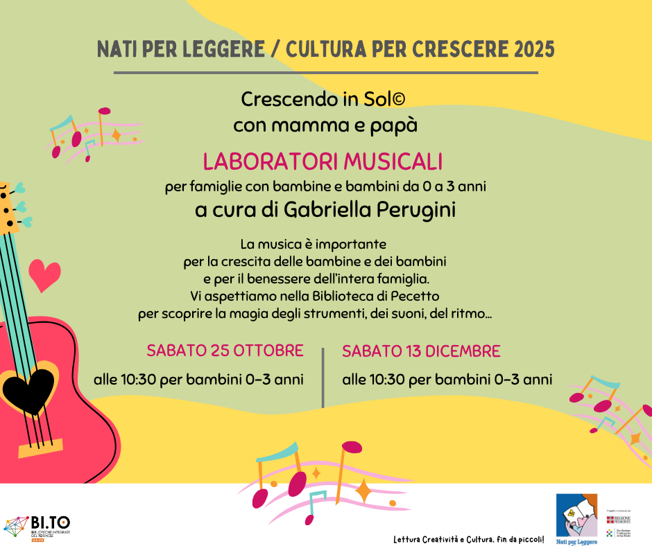 Sono aperte le iscrizioni per i due laboratori Crescendo in Sol, condotti da Gabriella Perugini, musicista, musicoterapista ed esperta di pedagogia musicale. I laboratori non sono solo un’attività divertente per i bambini, ma vere e proprie occasioni di comunicazione e connessione tra genitori e figli.