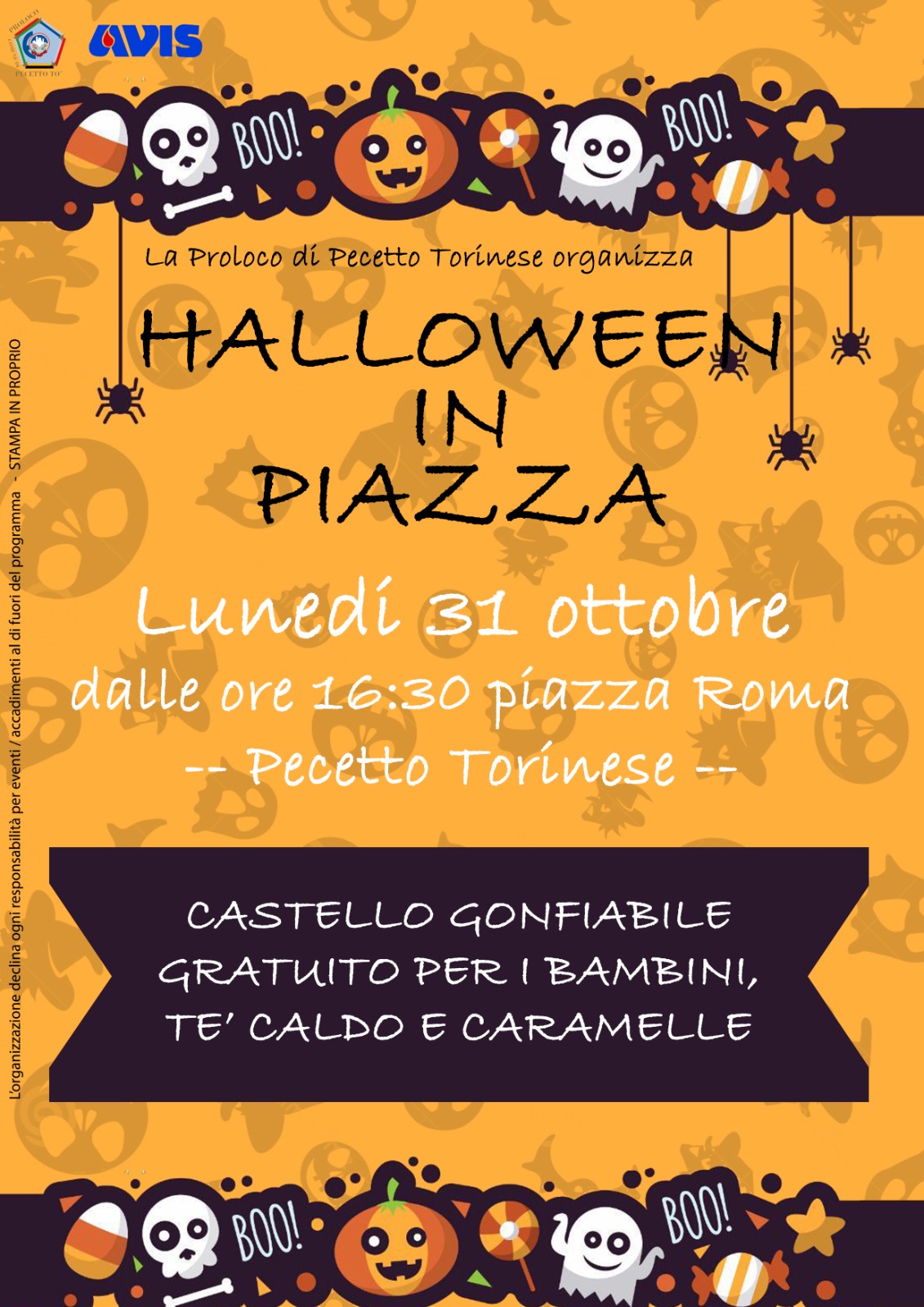 La Pro Loco Pecetto organizza la manifestazione denominata “Halloween a Pecetto” che si svolgerà lunedì 31 ottobre 2022, in Piazza Roma, a partire dalle ore 16.30.
