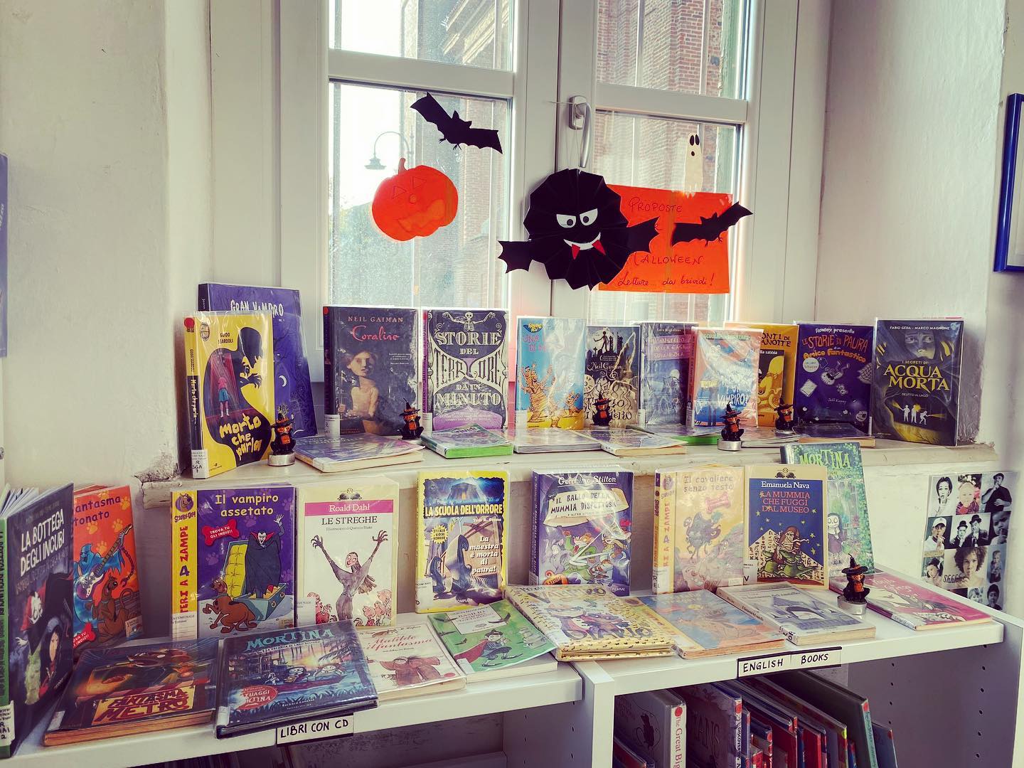 - E sempre a tema Halloween (foto al fondo) tanti libri a tema attendono bambini e ragazzi in biblioteca... C'è chi lo ama e chi lo detesta: Halloween divide! Ma per i bambini è senz'altro una grande festa: si gioca con le paure e con i travestimenti. Per noi bibliotecari è un'occasione in più per avvicinare bambini e bambine, anche quelli meno inclini, ai libri e fare promozione alla lettura. Ecco perché la Sala Ragazzi si è riempita di tante proposte di lettura, più o meno paurose, più o meno spiritose e avventurose, anche queste divise per fasce d'età!