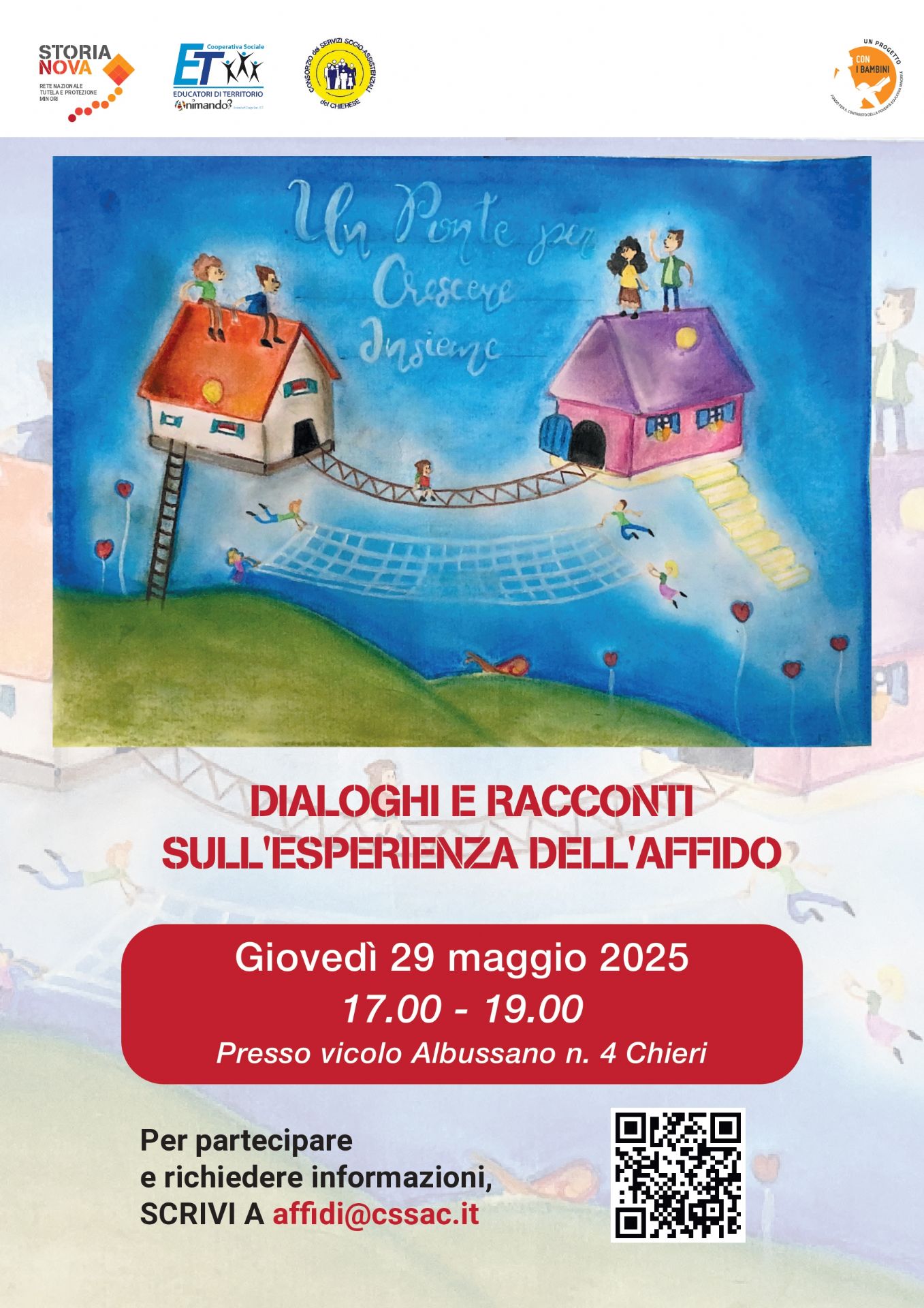 Invito a partecipare il giorno 29.05.2025 dalle ore 17.00 alle ore 19.00, presso Vicolo ALbussano n. 4 a Chieri, all'evento dedicato alla sensibilizzazione sul tema dell'affido familiare, organizzato dal Consorzio dei Servizi Socio Assistenziale del Chierese in collaborazione con il Terzo Settore.