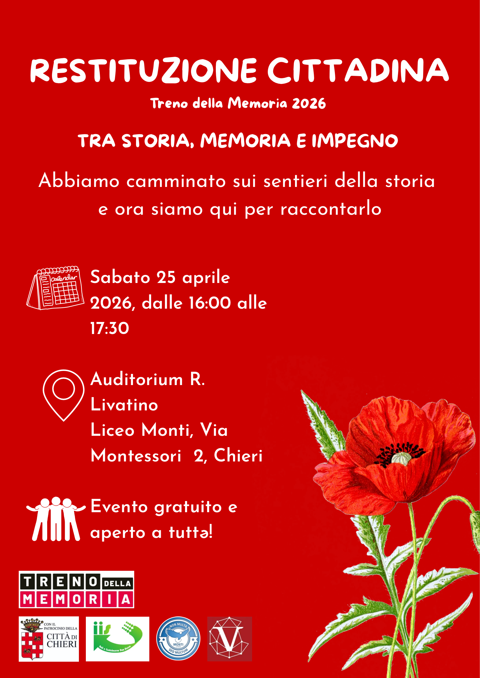 I ragazzi che hanno partecipato al progetto "Treno della memoria", avendo toccato con mano le testimonianze di uno dei momenti più bui della storia contemporanea, invitano alla restituzione pubblica cittadina organizzata per il 25 aprile 2026, dalle ore 16:00 alle ore 17:30, presso l’auditorium R. Livatino del Liceo Augusto Monti di Chieri